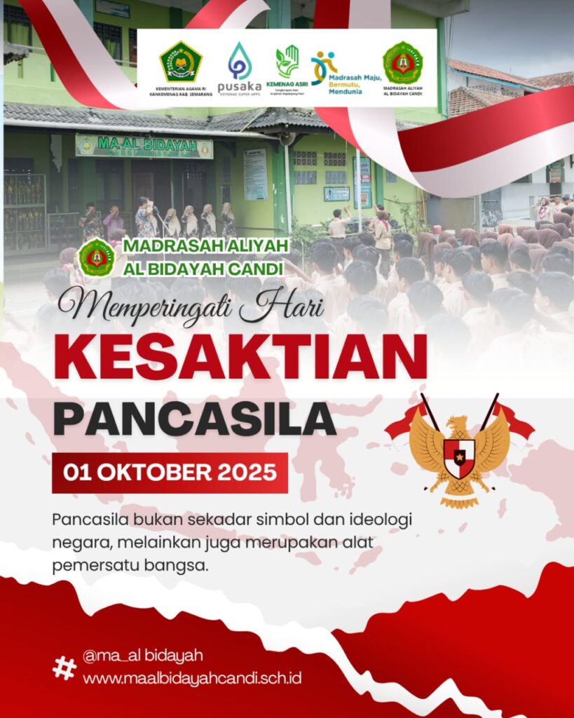 MA Al BIDAYAH melaksanakan upacara pengibaran bendera dalam rangka memperingati hari kesaktian Pancasila. Tanggal 1 Oktober 2025 adalah peringatan Hari Kesaktian Pancasila. Hari tersebut bukan merupakan hari libur nasional, tetapi diperingati dengan upacara bendera khususnya dilaksanakan di Madrasah Aliyah Al Bidayah Candi.