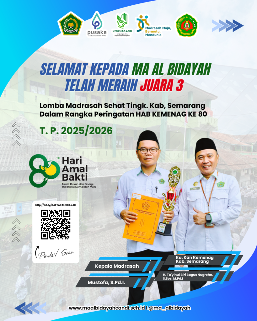 Semoga MA Al Bidayah menjadi lebih baik dan maju untuk menciptakan lingkungan yang bersih, sehat dan nyaman bagi warga madrasah dan masyarakat sekitar.